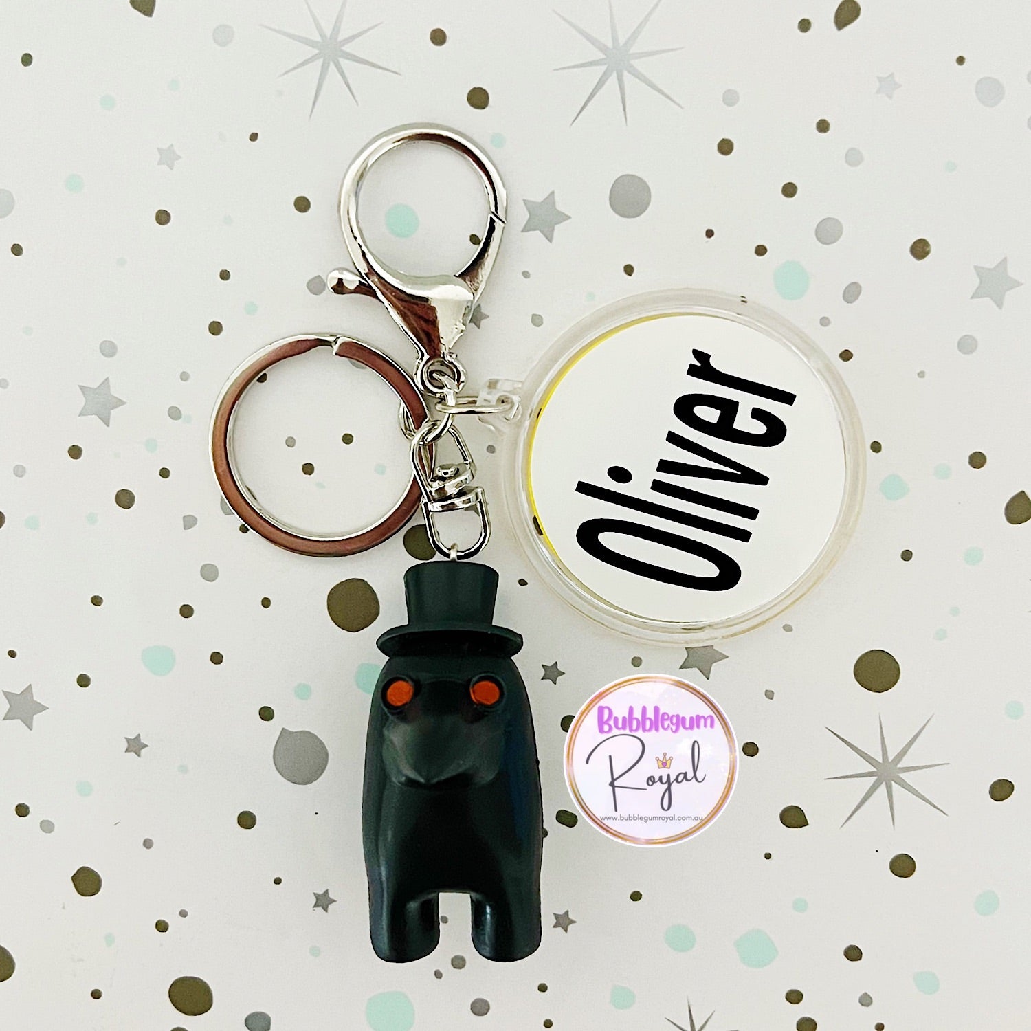 Our personalised keyrings/bag tags feature a 3D pendant, large swivel lobster clasp, split ring and personalised acrylic name plate.
